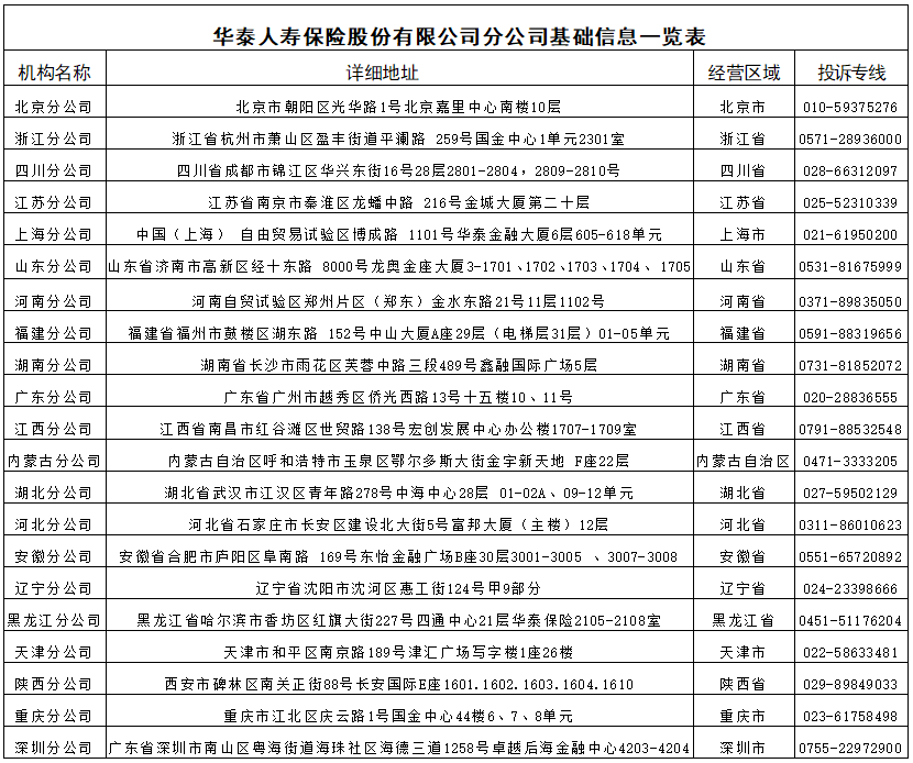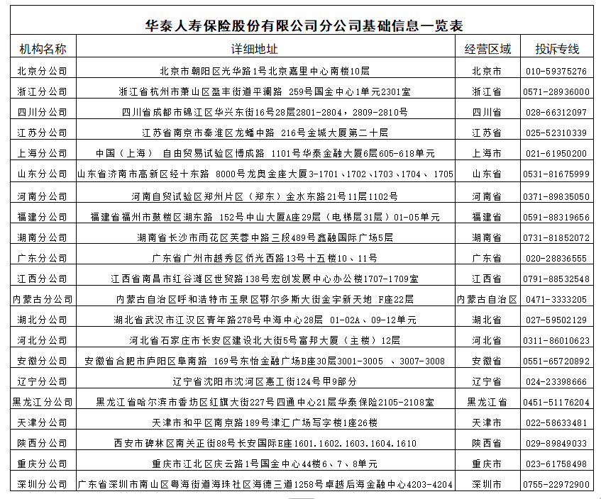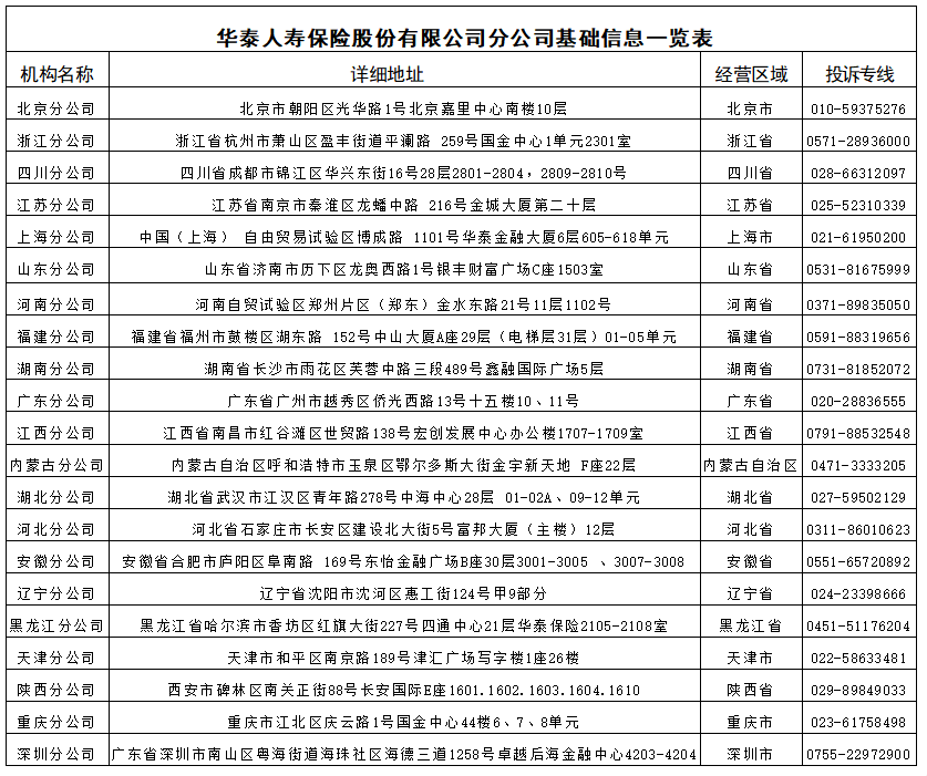 华泰人寿保险股份有限公司地址:北京市西城区金融大街35号国际企业大厦B座10层。分公司通讯地址见下表,更多详细通讯地址可登陆华泰人寿官方网站life.ehuatai.com,进入“公开信息披露”中“各分支机构营业场所和联系电话”点击查看。