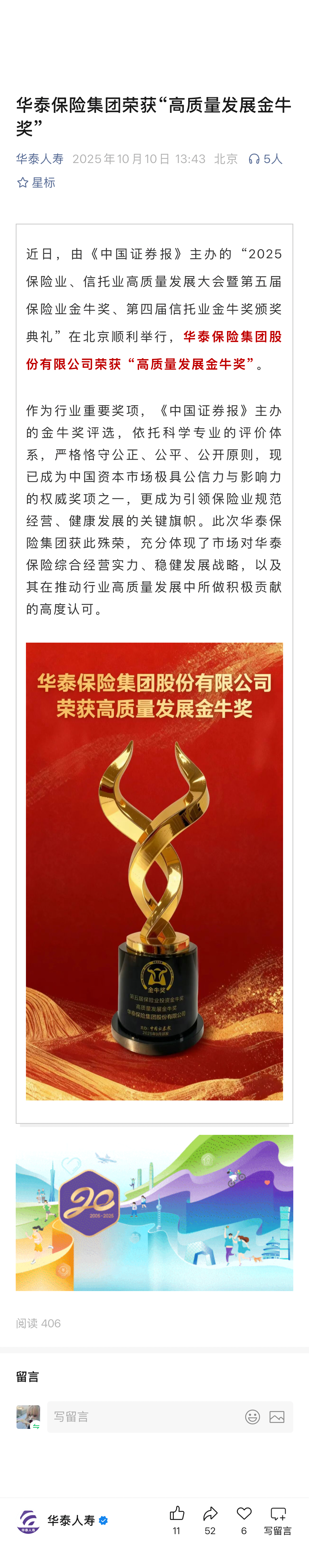 华泰保险集团荣获“高质量发展金牛奖”