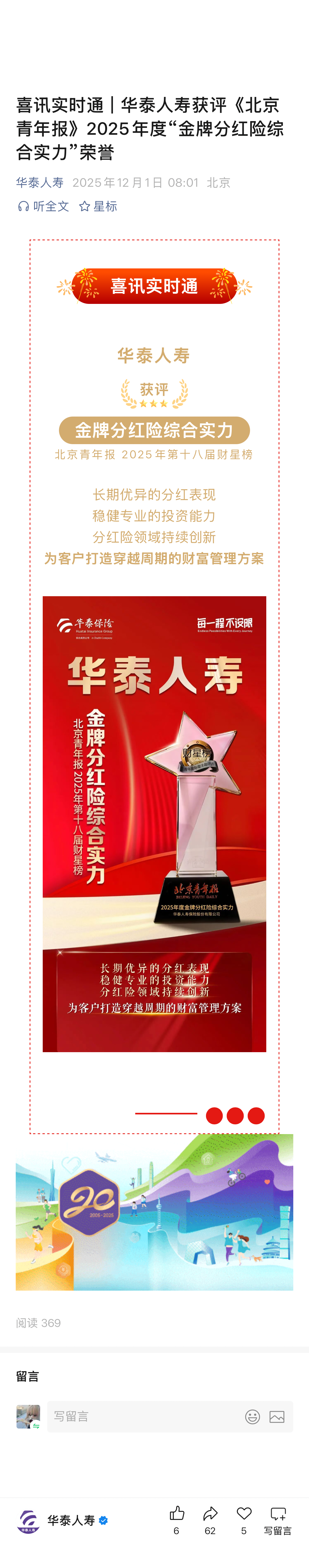 华泰人寿获评《北京青年报》2025年度“金牌分红险综合实力”荣誉