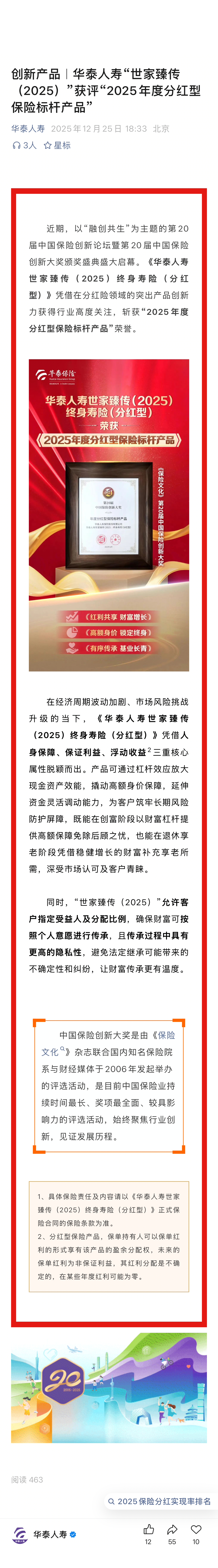 华泰人寿“世家臻传(2025)”获评“2025年度分红型保险标杆产品”